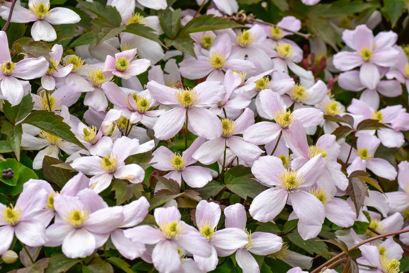 Clematis montana rubens Superba is a vigorous and floriferous climbing clematis prized for its abundant pale pink, lightly fragrant flowers that carpet the plant in late spring and early summer, creating a stunning curtain of colour.
